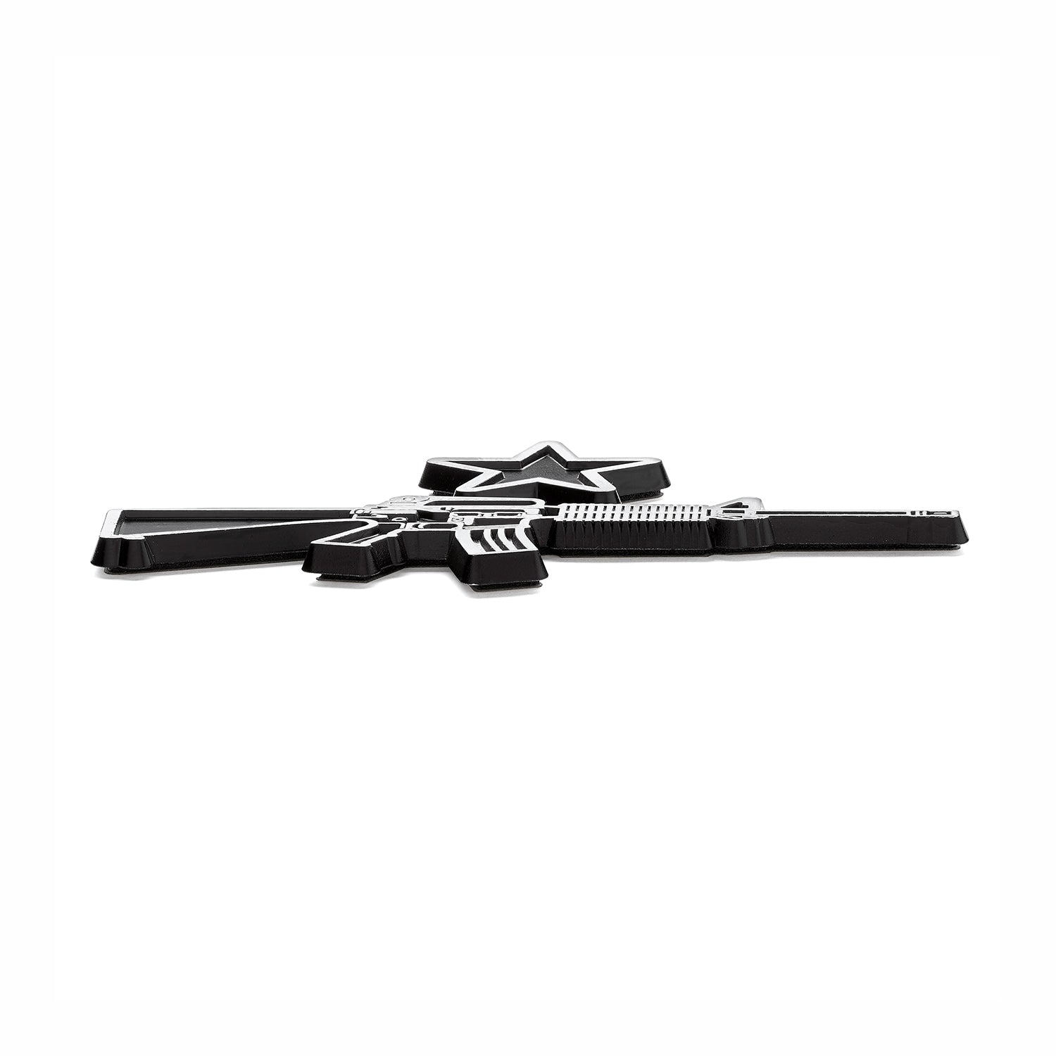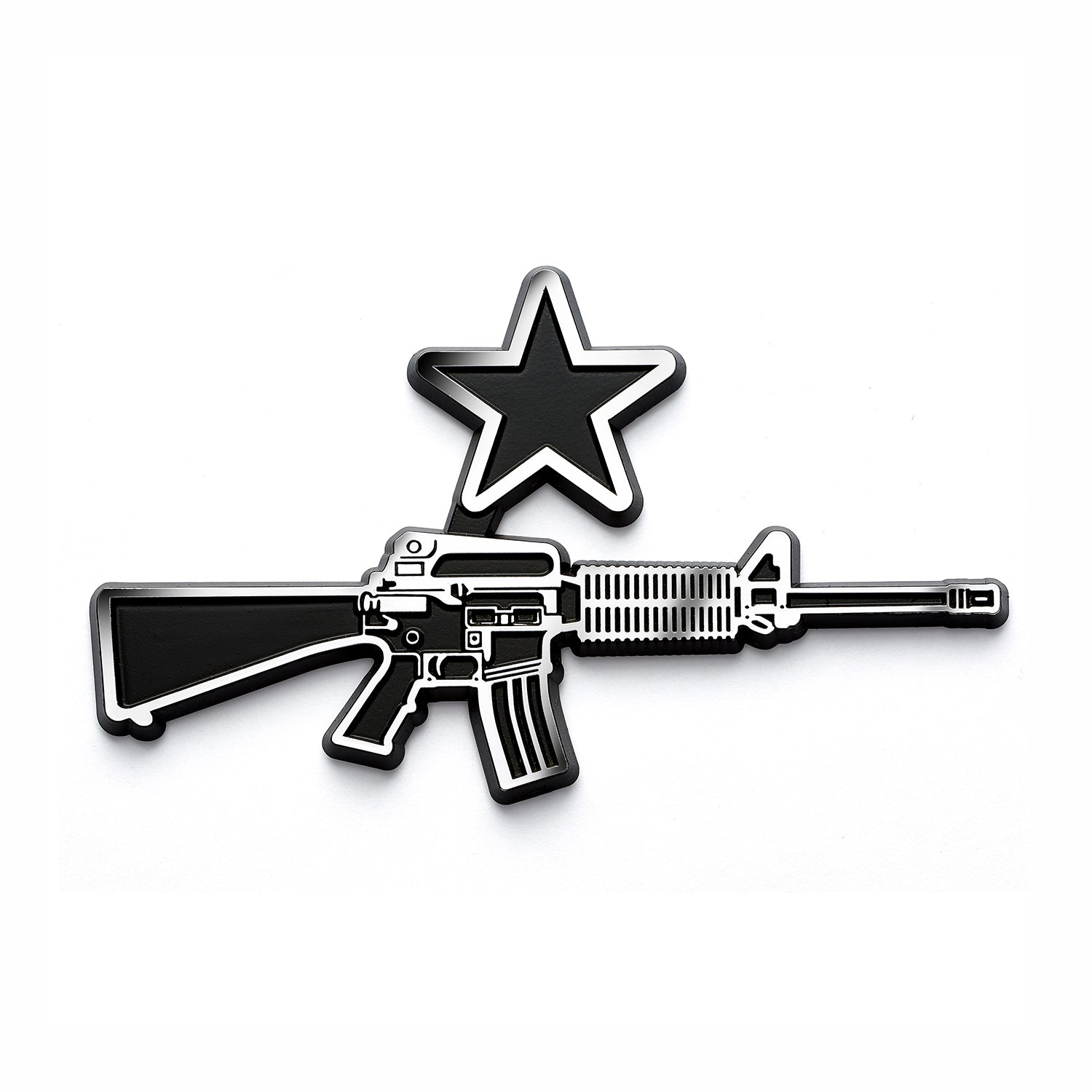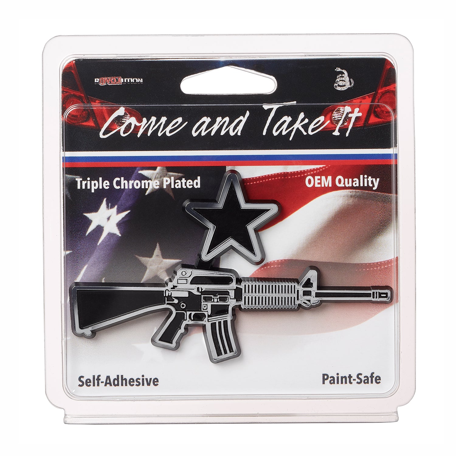 The original AR-15 rifle style "Come and Take It" Chrome and Black car emblem by Revolution Car Badges is a modern symbol of defiance based on the historical cannon flag of the Texas Revolution. It is manufactured with an automotive grade ABS plastic core which will never rust, unlike metal emblems. It is plated with a durable triple chrome plated metal finish, which will last the lifetime of your vehicle. This is the same manufacturing method used for the stock chrome emblems on your vehicle. Features polished chrome with black recess details, 3-D detailed top surface, triple chrome-plated metal finish, and paint-safe peel 'n' stick foam tape on the backside for easy mounting to your car or other surface. This emblem will hold up to high pressure washing without chipping or peeling off. A premium emblem to show your support for the 2nd Amendment and American freedom. Get the classy alternative to bumper stickers. Emblem measures 4" wide by 2.4" tall. Note: Do not apply in temperatures below 50°F (10°C).