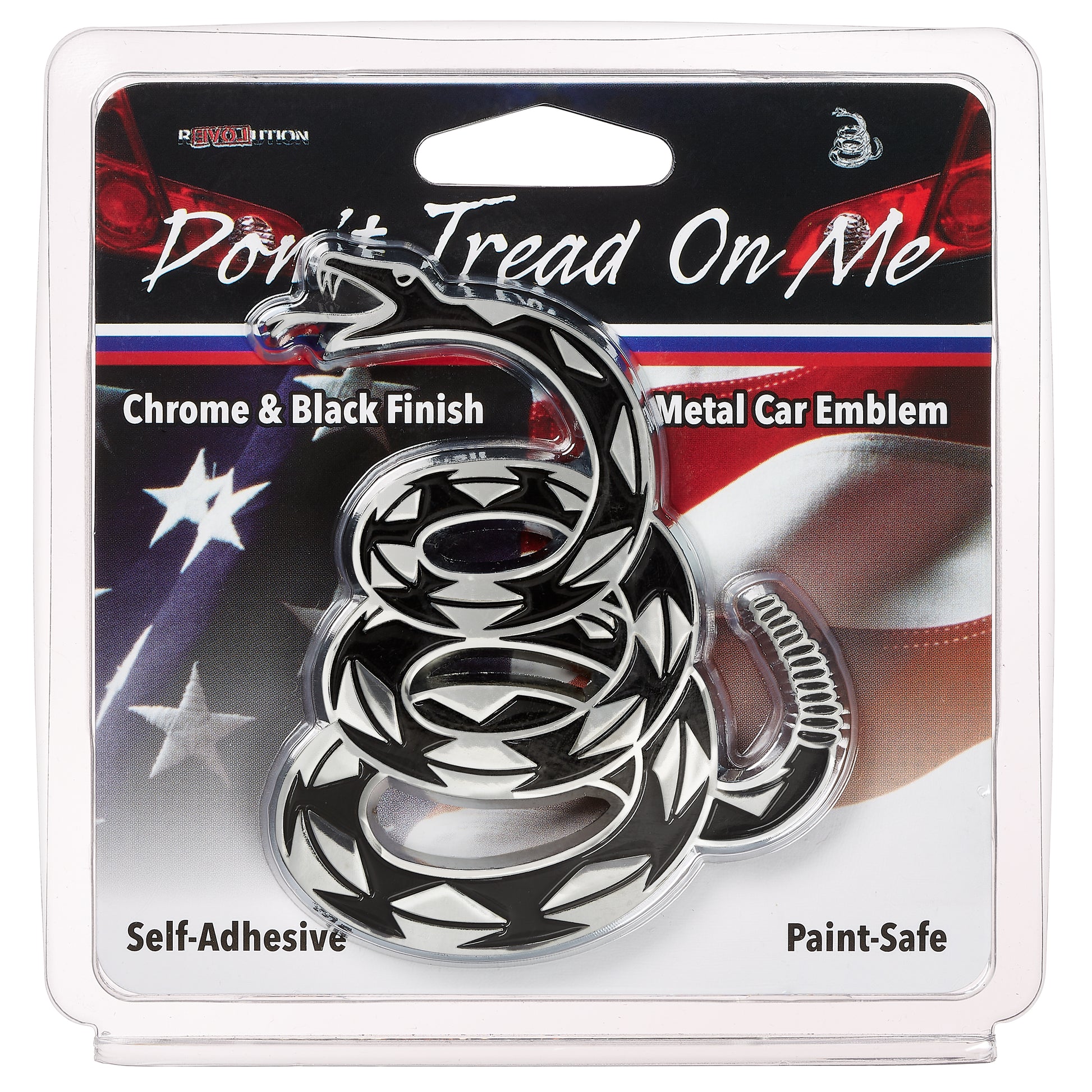 The original Gadsden "Don’t Tread On Me" rattlesnake chrome and black car emblem by Revolution Car Badges is based from the Gadsden Flag of the American Revolution or War for Independence of 1776. It is manufactured with an automotive grade zinc alloy metal core and is plated with a durable triple chrome plated finish with black painted accents. This is the same manufacturing method used for the stock emblems on your vehicle. Features polished chrome with textured recess, 3-D detailed top surface, triple chrome-plated metal finish, and paint-safe peel 'n' stick foam tape on the backside for easy mounting to your car or other surface. The automotive grade zinc alloy core and triple chrome plating ensure this emblem will last the lifetime of your car. Holds up to high pressure washing without chipping or peeling off. A premium emblem and classic piece of Americana to show off American independence and freedom. Get the classy alternative to bumper stickers. Emblem measures 2.75" wide by 3.50" tall. Note: Do not apply in temperatures below 50°F (10°C).